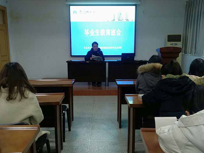 本网讯(文/摄 王瑞瑶)为加强毕业生管理,推进毕业生各项工作有序进行,12月28日下午五点,2015级思想政治教育专业在公司行政楼五楼会议室召开毕业生教育班会,班会由辅导员周楠主持,2015级政教专业全体本科生到场参加。