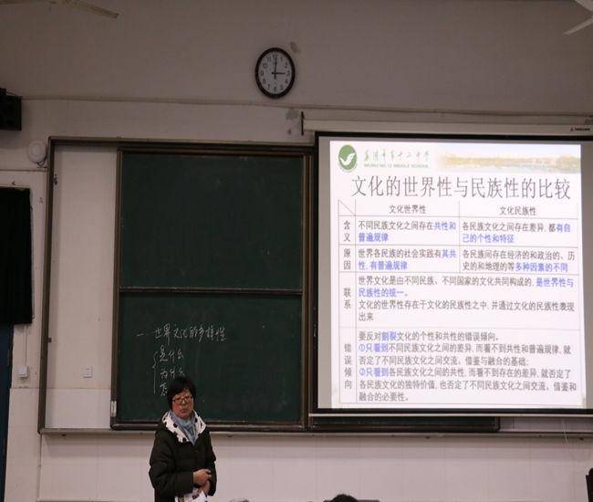 芜湖市十二中的高晓红老师就高中政治必修三《文化生活》第二单元第三课第一节《世界文化的多样性》内容为大家呈现了一堂精彩的公开示范课。课上,高晓红老师大胆地对教学方式进行了创新,她首先请了三位提前准备好课件的同学向大家进行了教学展示。三位高中生教学风格各异,充分利用图片、视频等多种教学资源,分别对什么是文化多样性、为什么坚持文化多样性以及怎样坚持文化多样性三个方面的知识进行了讲解。尤其是第三位同学的教学展示,不仅带动了课堂氛围,使师生互动更加频繁,也给即将走上实习岗位的我们带来了震撼与启迪。随后高晓红老师对三位同学的教学内容进行了总结,并再次强调了重难点知识,对于同学们没有涉及到的重要内容,高老师通过辨析、探究、热点链接、比较分析等多种形式进行了补充说明。最后,她通过框架式知识结构对本节课的知识进行了梳理。
