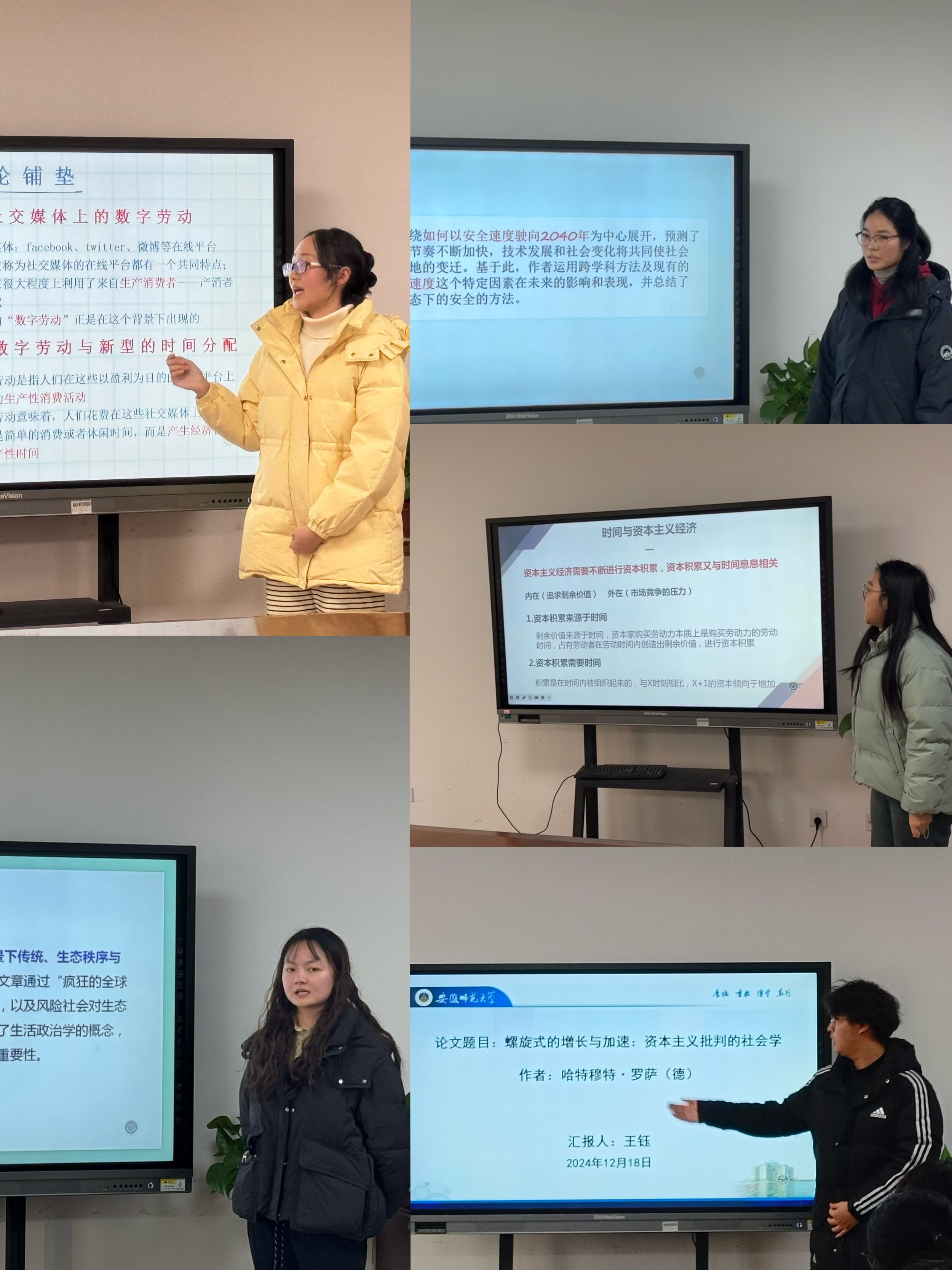 为了加强硕士研究生过程性培养,提升硕士研究生的专业素养,12月18日下午,国外马克思主义研究硕士点在文典楼G211会议室举办第1期社会批判理论读书会。国外马克思主义研究点单传友老师、吴兴华老师、陈旭东老师和王子廓老师出席指导。2024级全体研究生参加并汇报,2023级和2022级研究生出席旁听。
