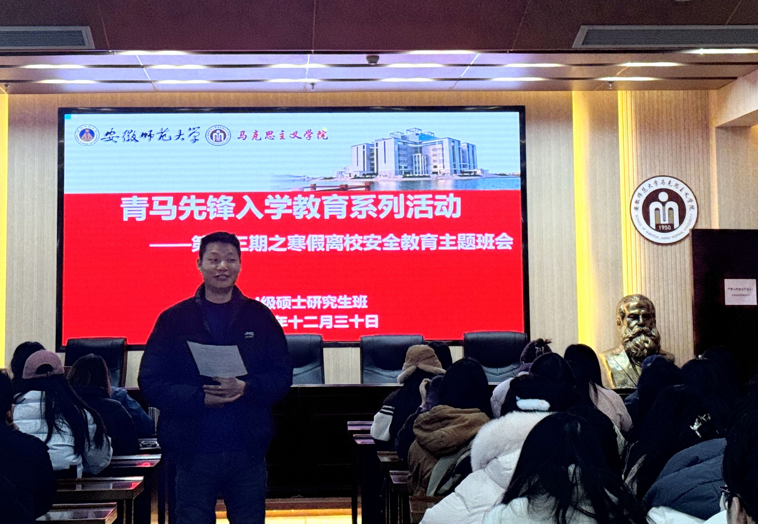 为进一步做好假期员工安全教育工作,加强对员工离校前的规范管理,12月30日下午,2024级硕士研究生在文典楼G108报告厅召开寒假离校安全教育主题班会,此次班会由辅导员夏盼盼主讲,2024级全体硕士研究生参会。