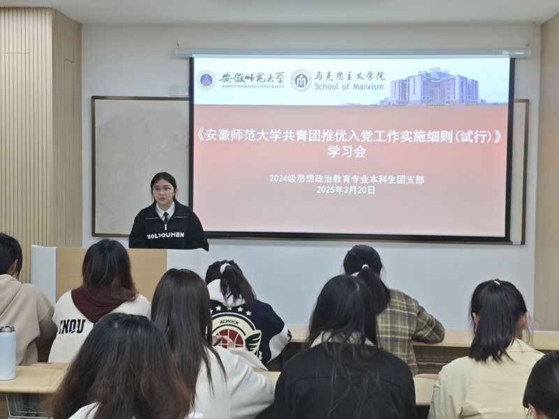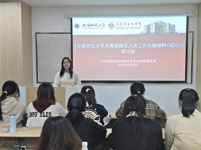 3月20日晚,2024级思想政治教育专业本科生团支部在望道楼E207教室开展《beet365官方网站共青团推优入党工作实施细则(试行)》学习会,本次会议由团支书叶成名、胡善丽、周佳怡、宫秀明主讲,全体团干部参加。