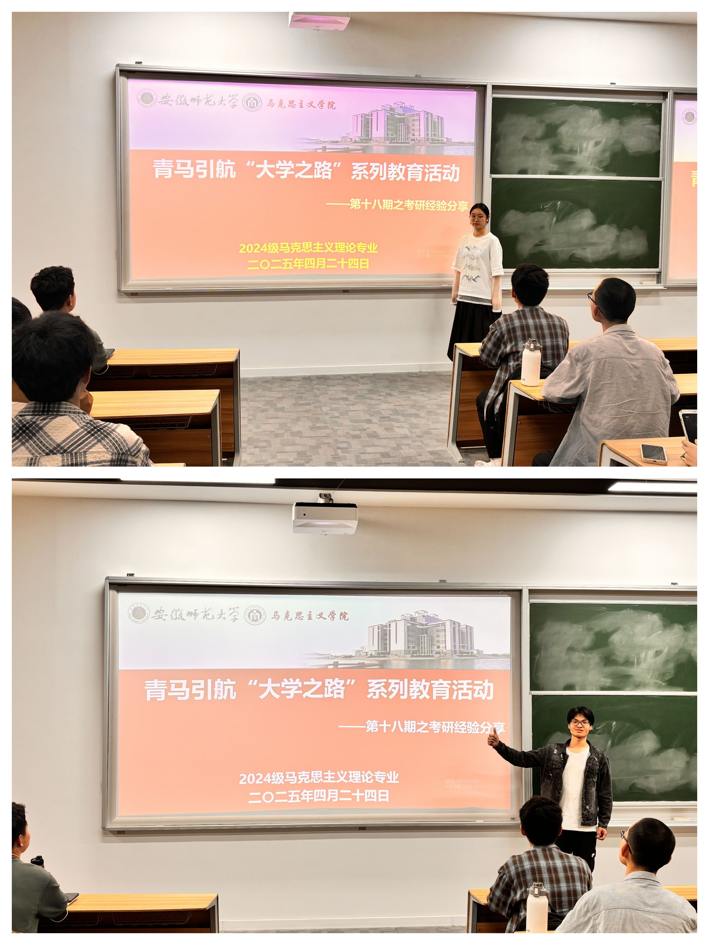 4月24日晚,2024级马克思主义理论专业在望道楼B102教室开展考研经验分享活动,活动邀请了2021级马克思主义理论专业本科生顾可欣学姐和刘扬帆学长为主讲嘉宾,班级全体同学参加。