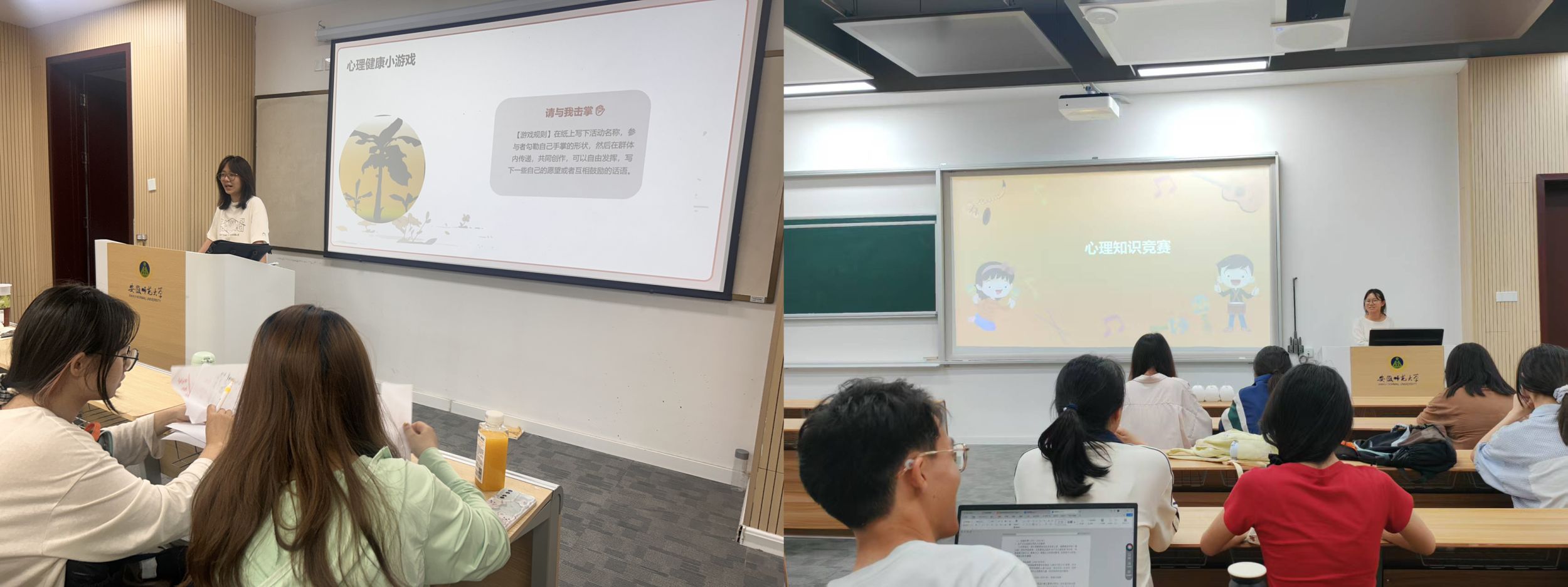 各班进行了名为“请与我击掌”的创意心理互动游戏和心理知识竞赛问答小游戏。活动现场的氛围非常活跃,同学们都踊跃参与其中。一位参与的同学分享说:“我原本以为这只是一场普通的游戏,但在看到别人在我的掌心写下的那些话时,我突然感到非常温馨。”