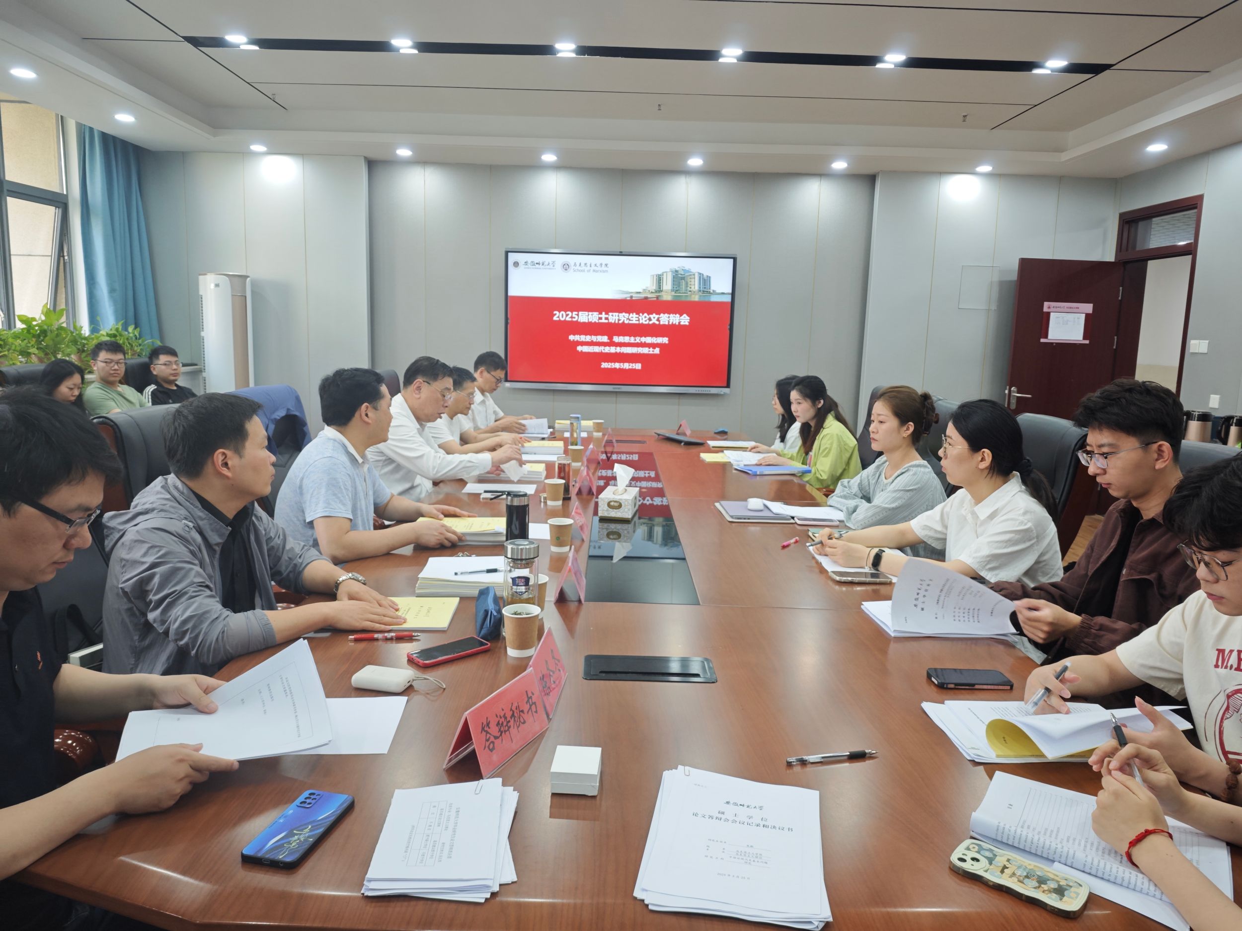 根据毕业论文答辩流程安排,各组答辩员工依次围绕论文的选题缘由和意义、研究综述、研究内容和框架、研究创新点和不足等方面展开汇报。汇报结束后,答辩委员会的老师们聚焦论文题目、研究内容、史料运用准确性、语言表达规范性以及参考文献引用格式等方面提出详细的修改意见,同学们针对答辩委员提出的问题进行了回答。最后,答辩委员会召开内部评议会,根据每位同学的论文情况进行审议并公布评议结果。