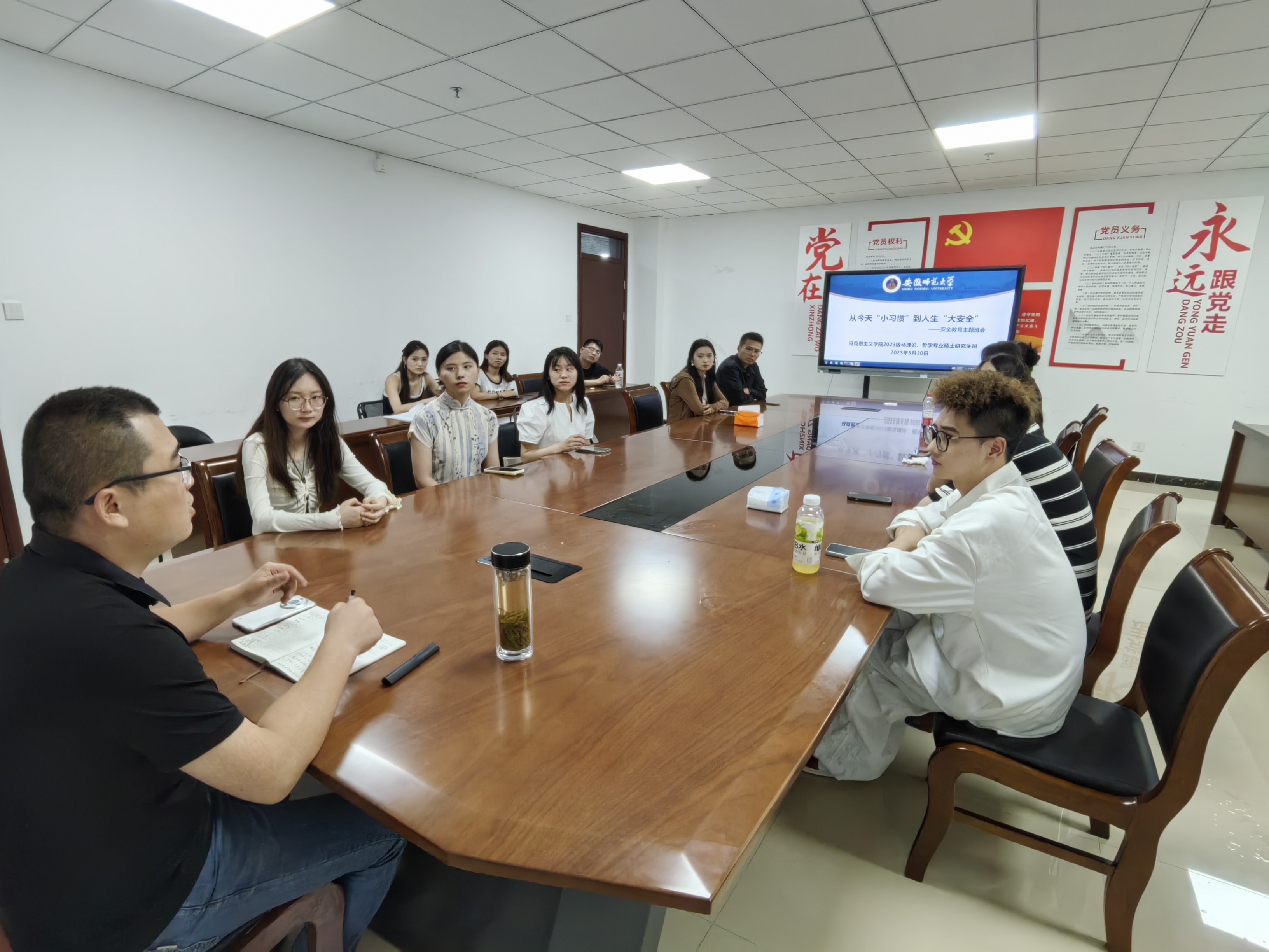 5月30日晚,2023级学术型硕士研究生班在文典楼G211会议室召开“从身边‘小习惯’到人生‘大安全’”主题班会。本次班会由辅导员李俊峰主讲,全体班委和寝室长参加。