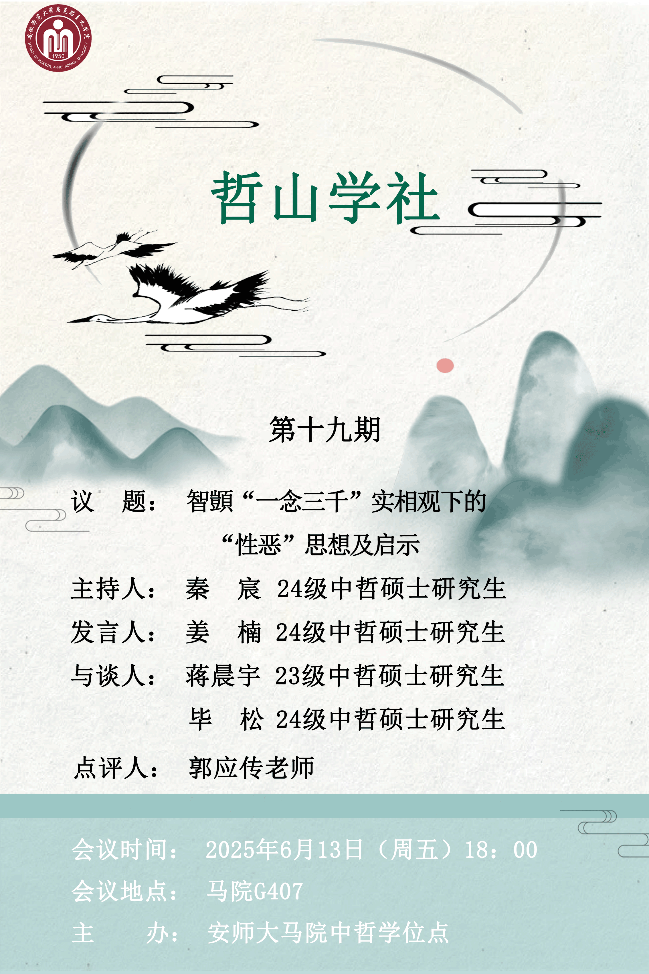 2025年6月13日,“哲山学社”第十九期论文研讨会在beet365G407举行。本次研讨会由24级中国哲学研究生姜楠主讲,题目为《智顗“一念三千”实相观下的“性恶”思想及启示》,蒋晨宇和毕松担任与谈人,秦宸主持,郭应传老师点评。