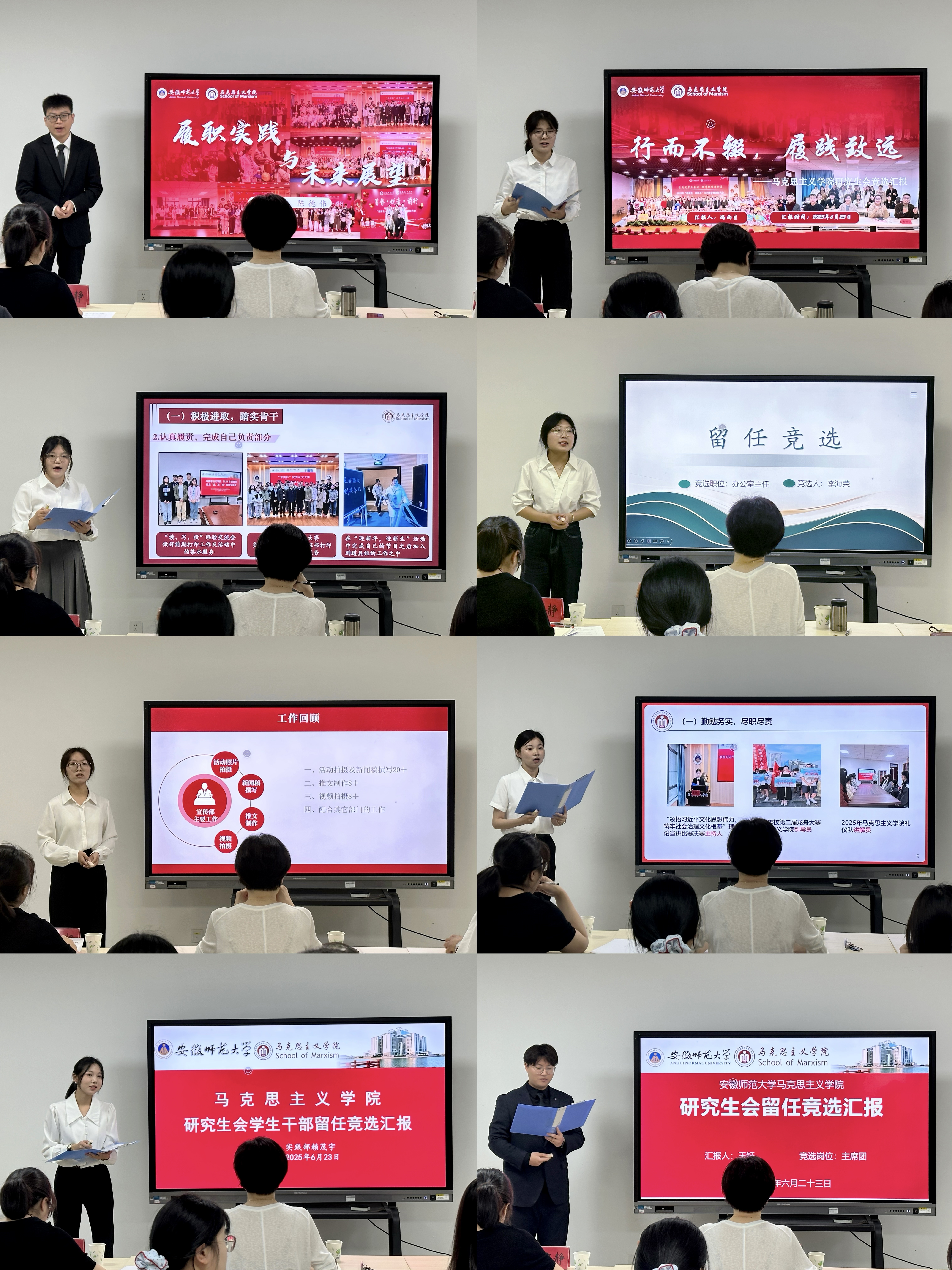 会上,8位留任候选人围绕个人简介、工作回顾、竞聘优势以及未来展望等方面依次上台进行竞选汇报,充分展现了研会成员积极进取的精神风貌和扎实的工作能力。