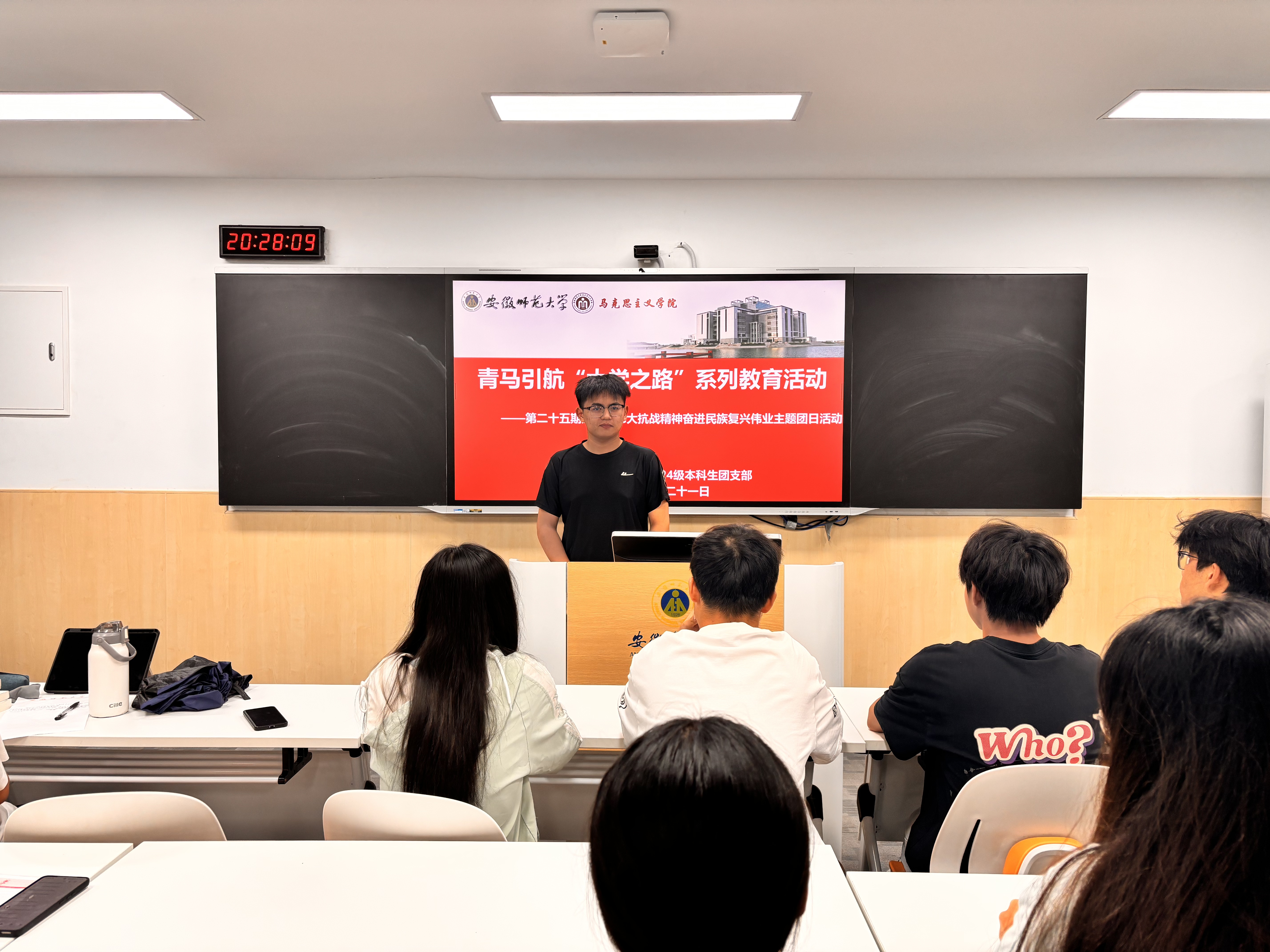 为纪念中国人民抗日战争暨世界反法西斯战争胜利80周年,深切缅怀抗战先烈,传承和弘扬伟大抗战精神,9月21日晚,2024级马克思主义理论专业在望道楼D401教室召开了弘扬伟大抗战精神奋进民族复兴伟业主题团日活动。本次活动由团支书陈沁茹主持,班级全体同学参加。
