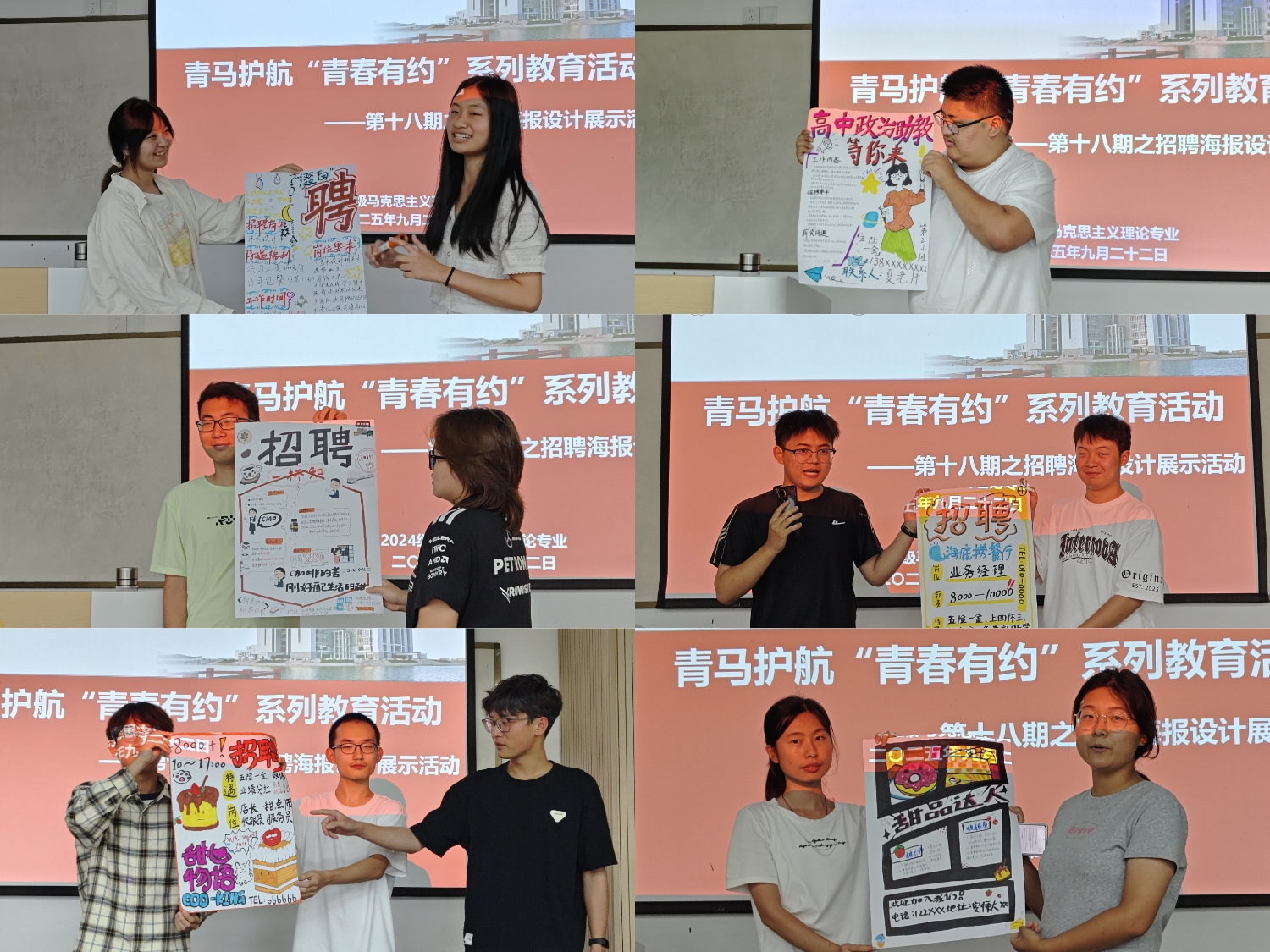 为增强员工对就业市场的认知,提升岗位匹配与自我展示能力,9月22日下午,2024级马克思主义理论专业在望道楼E210教室组织开展招聘海报设计展示活动。全班同学分为六个小组,围绕不同职业岗位进行招聘海报创意设计。