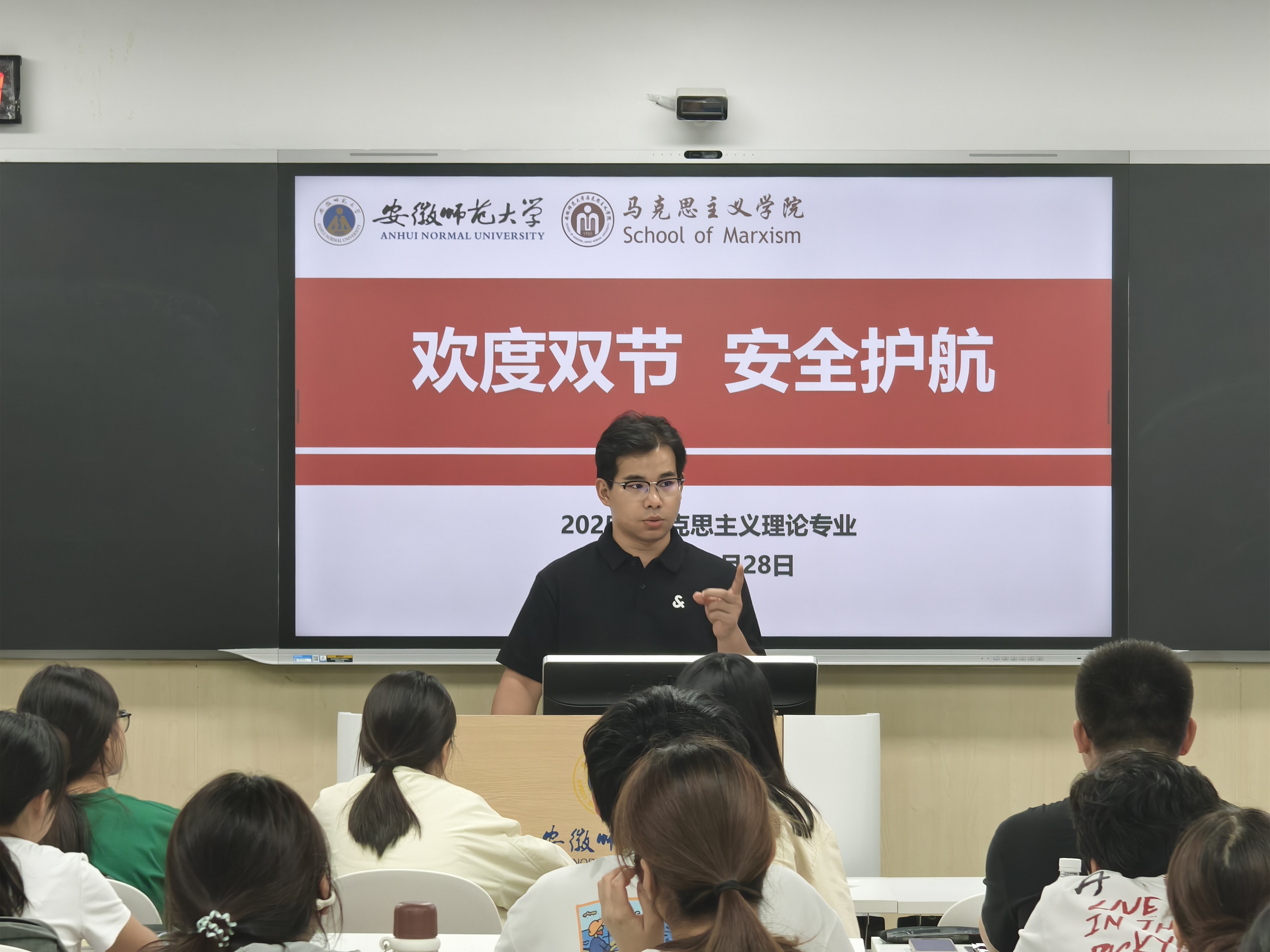 为保障中秋、国庆双节期间员工安全,强化自我保护意识,9月28日晚,2025级马克思主义理论专业在望道楼D401教室召开“欢度双节,安全护航”主题班会。班会由辅导员王梦雨主持,全体同学参与。