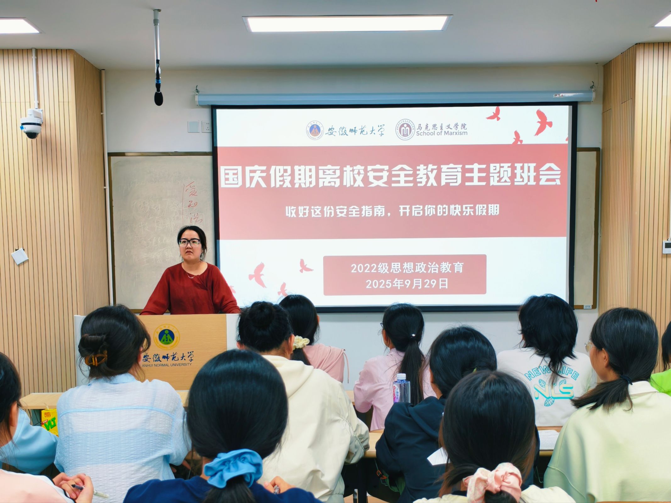 9月29日晚,公司2025级思想政治公司产品1班在望道楼E205教室召开国庆假期离校安全教育主题班会。会议由辅导员陶娴静主持,全体同学参加。