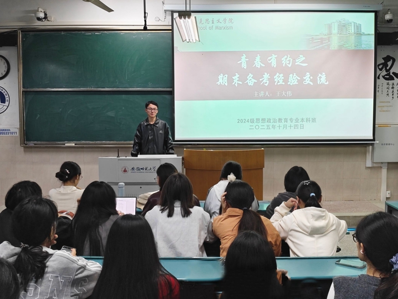 为助力同学们高效学习,掌握科学复习方法,10月14日晚,2024级思想政治教育专业本科班于行知楼2号楼101、102教室举办“青春有约”期末备考经验交流活动。活动由黄悦冉、林生荣主持,王大伟、刘毅担任主讲,全体同学积极参与。