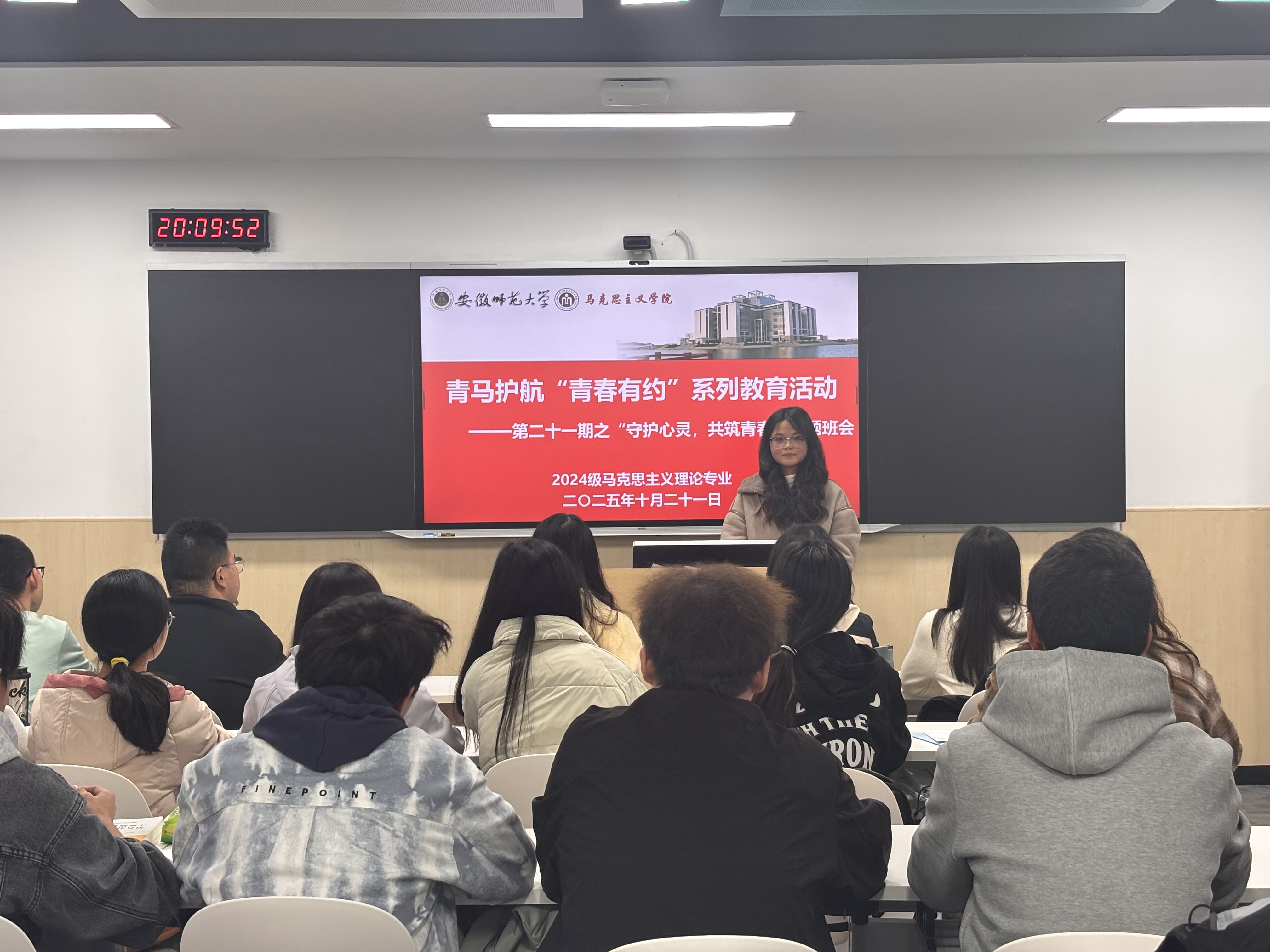 10月21日晚,2024级马克思主义理论专业全体同学齐聚望道楼D401教室,开展了以“守护心灵,共筑青春”为主题的心理健康班会。本次班会由心理委员乔馨馨主持。