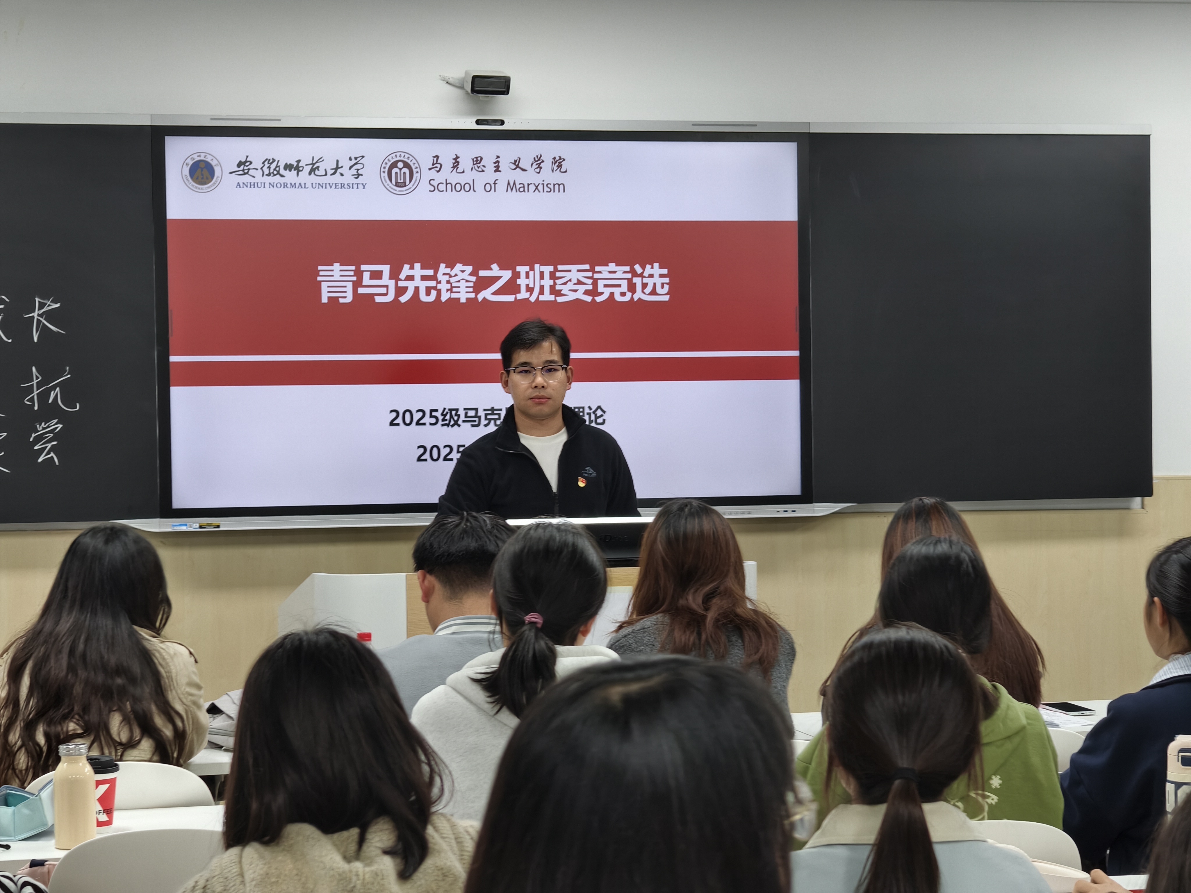 为夯实班级管理根基,营造优良班集体氛围,10月22日晚,2025级马克思主义理论专业1班在望道楼D401教室开展班干竞选。本次活动邀请2023级马克思主义理论专业班长王诗妍、团支书张思嘉、组织委员管程成,2023级思想政治教育专业3班团支书徐佳乐担任评委。活动由辅导员王梦雨组织,全体新生参与。