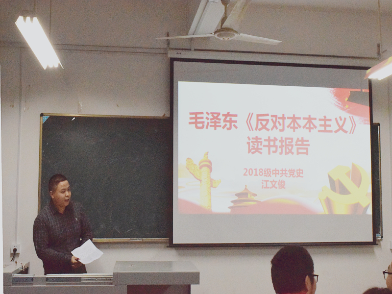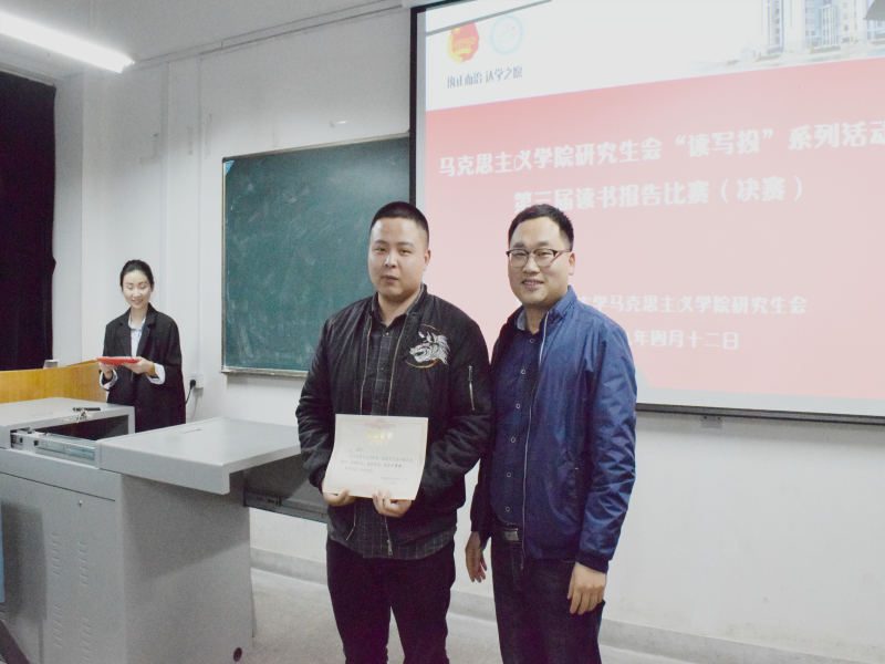 经过激烈的初赛选拔,共有十二名选手进入决赛。各位选手依次上台认真的分享自己的读书心得,评委老师则依据选手们的汇报内容进行提问,由选手们作答。在比赛过程中,选手们的表现从容自如,分别从书籍和文章的历史背景、主要内容和收获感悟三个方面进行阐述,将自己获得的感悟与体会娓娓道来。马中化的龚迎迎分享了阅读《中国革命和中国共产党》后的心得体会,主张我们要把握毛泽东思想精髓,坚持理论联系实际;伦理学的李文琴阅读《论德行友爱的产生》后倡导大家在生活和学习中应树立正确的幸福观和德行观;中共党史专业的江文俊同学则从《反对本本主义》中总结出“不积跬步无以至千里”、“板凳甘坐十年冷,文章不写半句空”的观点。经过两个小时的激烈角逐,江文俊同学以精彩的讲解和鞭辟入里的文章分析获得本次比赛的一等奖。