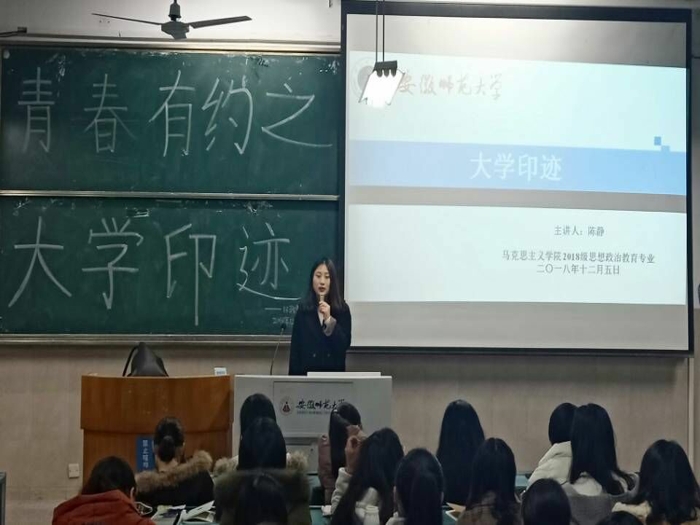 本网讯(文/方序 摄/夏雨)12月5日晚,beet3651于教学楼2020203教室举办“青春有约之大学印迹”主题讲座。讲座邀请到公司今年推免至上海交通大学的15级政教陈静主讲,全体18级思想政治教育专业员工参加。