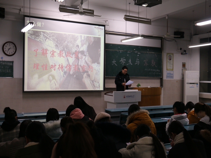 本网讯(文/常欣雨 摄/田皓月)为增强同学们对宗教信仰的了解,牢牢把握党的宗教政策和社会主义大学的育人目标,12月12日晚七点,beet36516级思想政治教育专业于2030204教室开展了老员工与宗教信仰主题班会暨团日活动,此次活动由团支书许轲及副班长钟志浩主持,16级政教专业全体本科生参加。