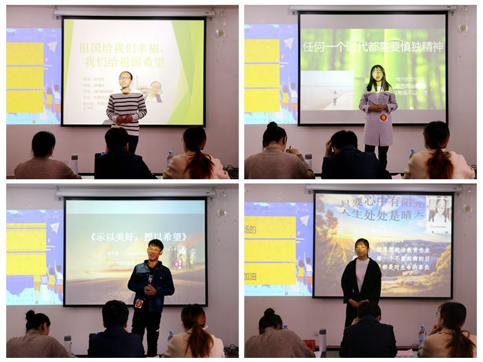 11月11日下午,公司在五楼会议室举行了第七届“超级演说家”决赛。2018级研究生辅导员脱颖,院团委副书记助理王淑梅,研究生会主席黄小燕担任决赛评委。比赛由文艺部部长董安琪主持,员工会全体成员及部分2018级本科新生观看。