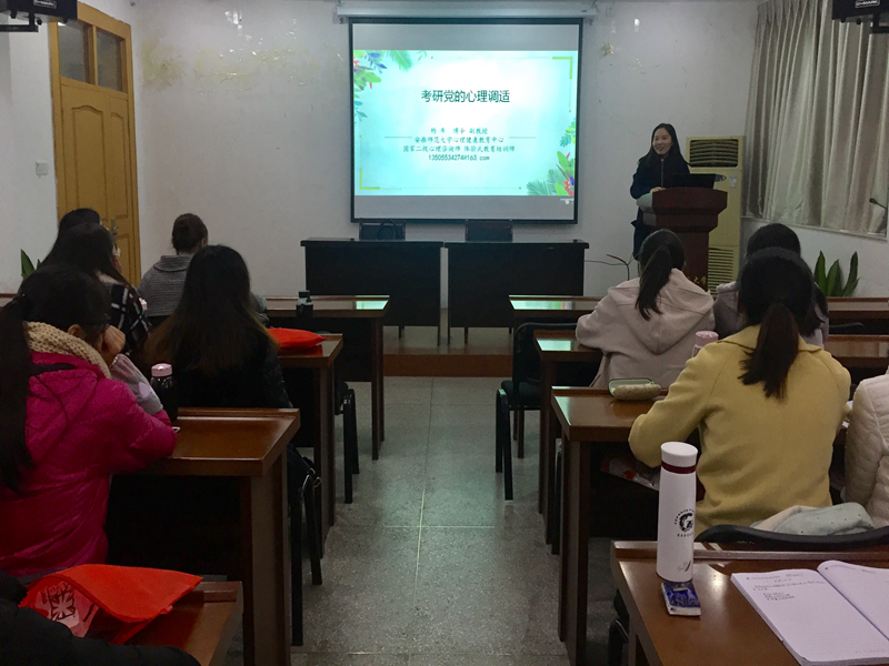 本网讯(文/王诗茹 摄/李嘉欣)为了缓解备考同学们的压力,11月21日下午,beet365在五楼报告厅举办了考研心理调适讲座。讲座邀请了公司二级心理咨询师、副教授杨希老师作为主讲人, 2015级思想政治教育专业部分考研员工到场参加。