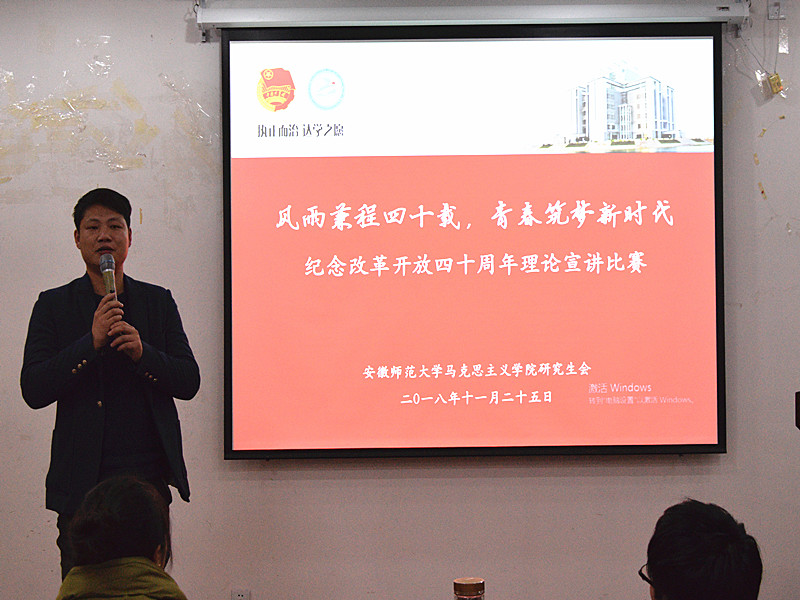 (文/刘伟 摄/江文俊)11月25日晚6点半,公司研究生会在院五楼会议室举办了以“风雨兼程四十载,青春筑梦新时代”为主题的理论宣讲比赛。院团委负责人夏盼盼、2017级研究生辅导员李晨冉、2018级研究生辅导员脱颖、院研究生会主席黄小燕和中国特色社会主义理论体系研究会会长宋文瑛担任评委。此次比赛由实践部委员范硕硕主持。