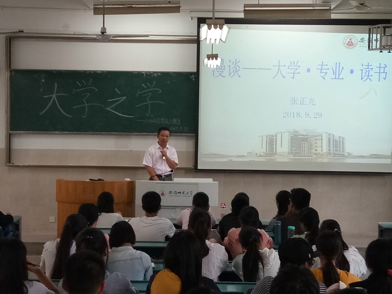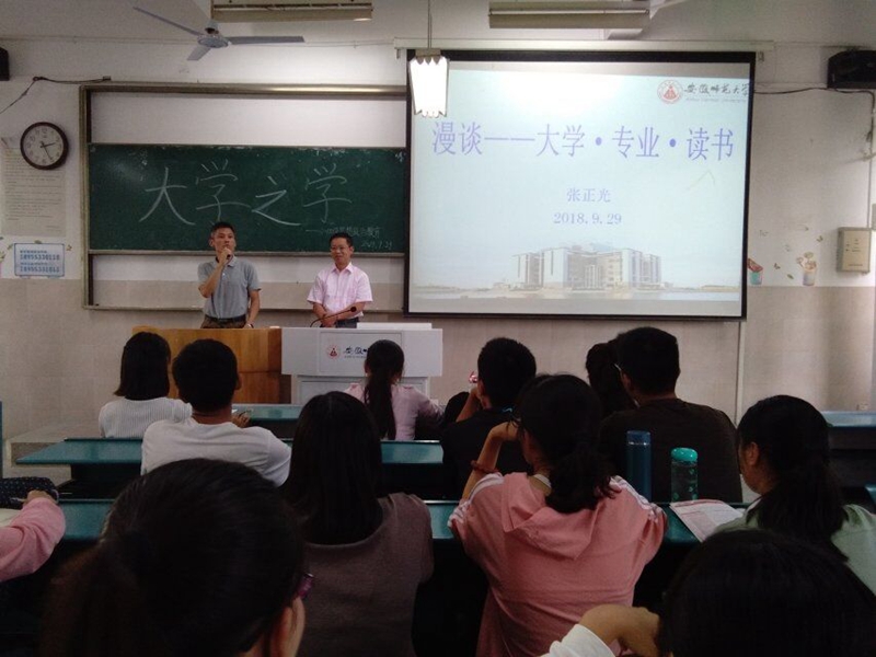 本网讯(文/吴昀摄/方序)9月29日下午,beet365于行知楼2020203教室举行新生入学教育“大学之路系列讲座之大学之学”,由博士生导师张正光教授主讲,公司党委副书记梁齐军主持,2018级全体新生参加。