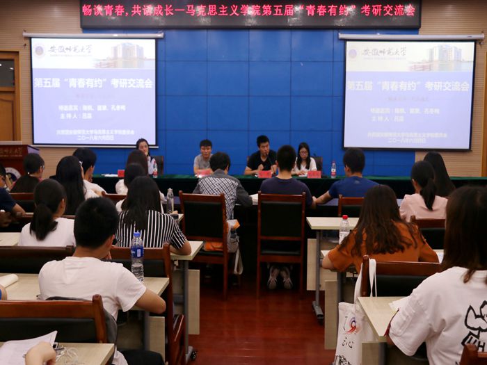 本网讯 (文/摄 叶钟昊)青春途中共话成长,考研路上你我同行。为让同学们对考研有进一步了解,增强他们的自信心,6月4日晚上七点,公司在圆形报告厅举办第五届“青春有约”考研交流会。本次活动邀请了在2018年考研中获得优异成绩的陈枫、苗犟、孔冬梅作为嘉宾,2015级本科生吕露担当主持人。2015级、2016级、2017级思想政治教育专业本科生到场聆听。