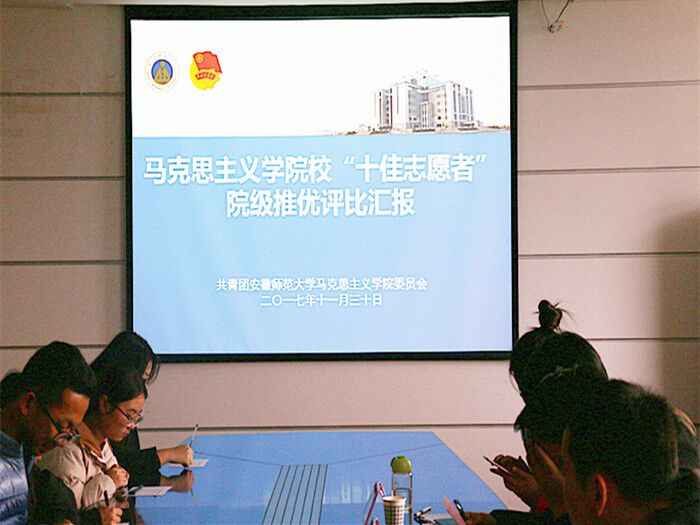 本网讯(文/彭静 摄/刘佳)为展示员工风采,促进志愿活动的进一步发展,11月30日上午,学院在四楼会议室举办校“十佳志愿者”院级推优评比活动。院团委负责人兼2016级、2017级本科生辅导员夏盼盼、研究生辅导员曹磊、杨光宝、李晨冉担任评委,部分本科生作为大众评审参加了此次活动。