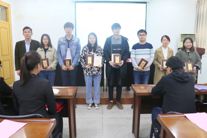 第五届院员工会副主席叶丹、院团委助理柯龙杰、爱智哲学社会长陈院琴先后进行发言。他们总结了过去一年的员工工作,并激励新成员在工作中勤奋努力,不悔初心。院员工会文艺部委员17级本科生张宝在发言中承诺会严格要求自己、不断完善自身,表示已准备好全心全意为同学服务。随后,梁齐军为2016-2017学年团委、员工会和员工社团主要员工干部颁发聘书和纪念品,并合影留念。