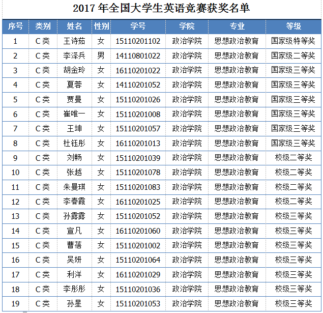 本网讯(政治公司 孙露露)日前,全国老员工英语竞赛组委会公布了2017年竞赛获奖名单,公司学子在本次竞赛中发挥出色、取得佳绩,共有8名员工获得国家级奖项,其中2015级思想政治教育专业王诗茹同学获得国家级特等奖、2014级思想政治教育专业李泽兵同学获得国家级二等奖、另有6名同学获得国家级三等奖,此外还有11名员工分别获得校级奖项。
