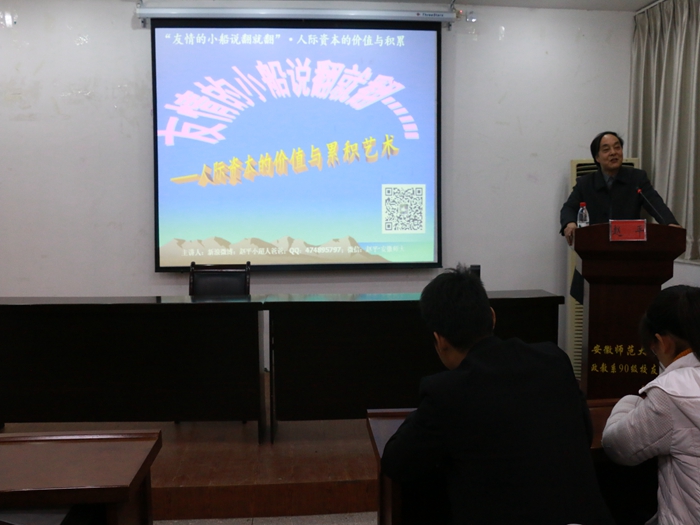 本网讯(文/郭紫琼 摄/安红旸)为了让同学们学会恰当处理人际关系,更好地与他人交往。11月30日晚,公司赵平教授应邀在公司五楼会议室为同学们开展主题为“人际资本的价值与累计艺术”的讲座,2016级思想政治教育专业的全体员工到场聆听,本次讲座由辅导员夏盼盼主持。