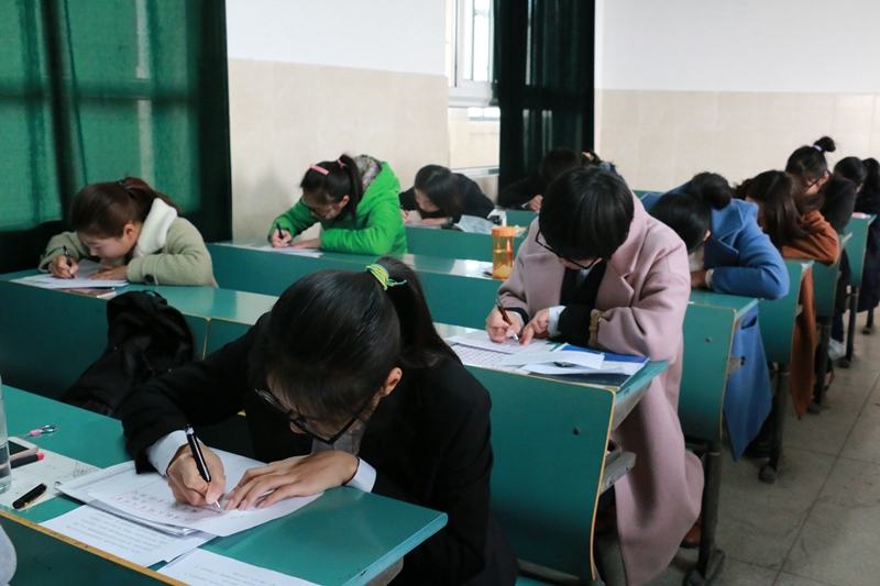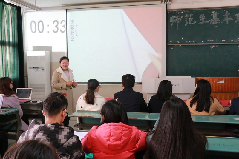 本次比赛共分为钢笔字书写、粉笔字书写和五分钟课程导入三个环节。钢笔字书写限时十分钟,选手们专心致志,用心书写每一笔笔画、每一个汉字。随后,选手们分批进行内容为“纸上得来终觉浅,绝知此事要躬行”的粉笔字书写。作品或洒脱大气、或飘逸舒展,其运笔与结构都形神俱佳。五分钟课程导入的主题是高中政治课本政治生活的内容,选手们准备充分,结合精心制作的幻灯片以生动的讲解展开课程导入,他们结合时事新闻,联系生活实际,以此切入教学内容。课堂教学目标明确,思路清晰,过程设计合理,语言表达准确精炼,教学方法独特新颖。整场比赛在紧张又愉快的氛围中井然有序地进行着。