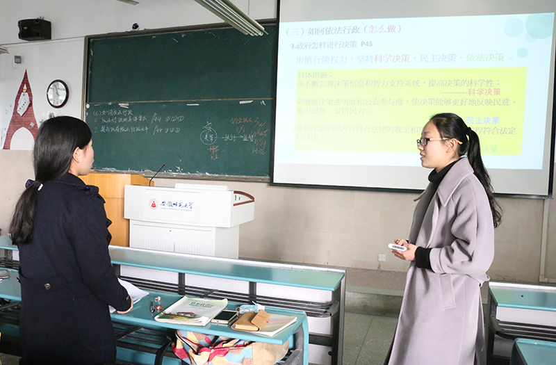 本网讯(文/苏芳菲 摄/刘淇梦)为了进一步做好公司思想政治教育专业教育实习工作,加强对实习工作的管理,提高实习质量,2月25日,公司对2014级思想政治教育专业教育实习进行第二次微格教学训练活动,九组实习小组组员分别在行知楼各教室进行微格教学训练,每组指导老师到场亲授经验,低年级政教学子到场观摩学习。