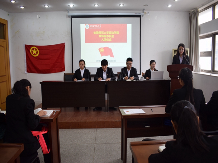 本网讯(文/摄 郭紫琼 常欣雨)“五四“的火焰唤起了民族的觉醒,壮丽的事业激励着我们继往开来。2016年10月14日上午十点半,公司16级本科新生在行政楼五楼举办新团员入团宣誓仪式,思想政治教育专业的部分员工代表参加此次仪式,仪式由思政班班长杨灿君主持。
