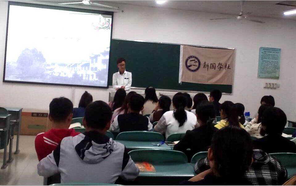 社团的发展离不开指导老师的引导,作为芜湖市传统文化促进协会的会长,周元琳教授用“上善若水,刚毅果敢,受思莫忘,博文约礼”十六字表达了对国学的理解以及对新国学社成员们的期待。同时,周老师还深刻阐释了国学在当今时代所存在的意义。指出在物质文明飞速发展的今天,精神文明建设显得犹为重要。只有物质和精神都富有了,我们国家才能屹立于世界民族之林。由于时间关系,另一位老师刘宏教授并未亲自到场,不过他为新国学社的成员们写了一篇文章来表示对大家的希冀,并在文中阐释了自己对国学以及新国学的理解与认知。刘老师告诉我们:通过读经典,我们会不自觉地将古人的人文素养内化到自己的内心,并付诸于我们的一言一行之中,进而影响他人,扩散至社会。