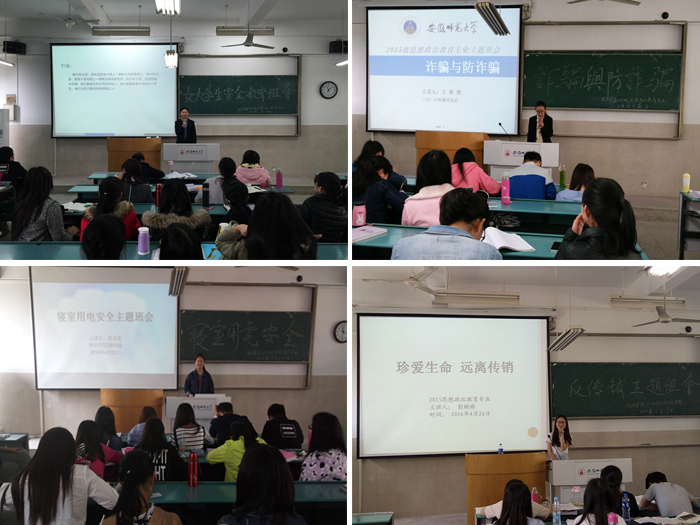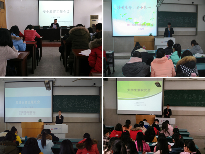 朋辈教育协同化。安全教育系列主题班会由2014级的员工骨干每人认领一个主题,每一个主题班会的内容均由辅导员周楠以及主题班会审核小组审核,反复讨论、修改合格之后才可以召开。安全教育系列主题班会首先在2015级新生班级召开、然后推广到其他班级。倡导推进朋辈教育,既增强了教育效果,又是对承担任务员工的一种有效的自我教育和锻炼。