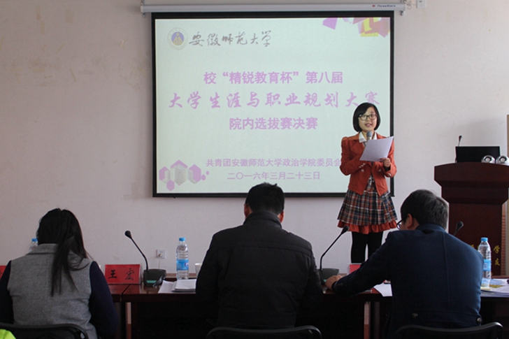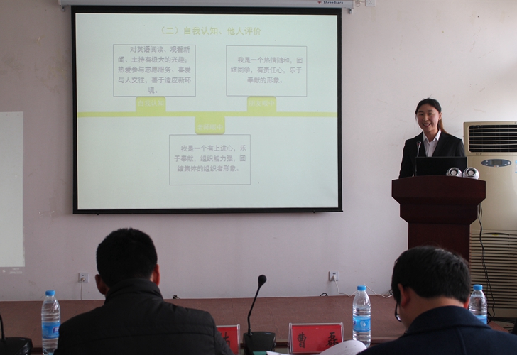 本网讯(文/摄 王春秀)追求卓越梦想,书写美好人生。3月23日下午两点,第八届“精锐教育杯”老员工涯与职业规划大赛院内选拔赛决赛在行政楼五楼会议室举行。2014级、2015级本科生辅导员周楠,研究生辅导员王宏,院团委组织部部长陈琪波、曹磊,研究生会宣传部部长沈泽俊受邀担任评委。耿秋芳担任本次比赛主持人。