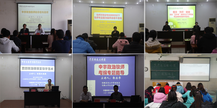 公司邀请数位教授、硕导、中学董事长为2014级思想政治教育专业员工开展各类讲座,包括“中学政治老师的价值与信仰”、“教团队格证改革背景下教师专业能力提升的若干思考”、“‘三大考’改革背景下师范生专业成长的路向与路径”、“思想政治课课堂教学艺术”、“中学政治教师考编专题指导”等主题。诸多讲座从师范生培养出发,在教师准入资格改革的大背景下,帮助员工坚守崇高信仰,实现教育价值,用理想教育点亮人性光辉;明晰教资改革,夯实从教技能,用扎实本领站稳三尺讲台;了解职业背景,明确成长路径,用日积月累以至完善自身。此外,公司还通过组织观看第四届长三角高校思想政治理论课教学比赛的视频进一步提升同学们的师范生基本功。