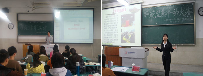 具备突出的说课能力是师范生从教的基本技能,学院通过举办师范生基本功大赛使同学们增强实践教学能力。选手们结合新闻、联系生活,切入教学内容;模拟互动、播放视频,活跃课堂氛围;增设问题、阐明观点,激发员工思维。此外,公司积极在各班级开展“课前三分钟演讲”活动。即以班级为单位、以学号为顺序利用上课之前的三至五分钟有序开展,每个学习日安排一至两名同学上台演讲。原则上演讲主题内容自选,或时政热点、或专业文化、或青春美文,话题各异各取其长。在一次次的讲述中,同学们逐渐有效提升了自己的表达能力和应变能力,为以后的教育工作积累了一定的经验。