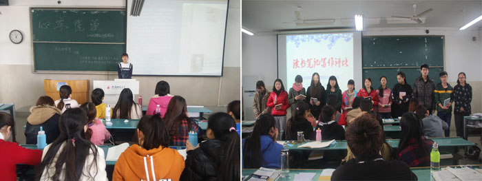 以书会友,书香溢园。2014级、2015级思想政治教育专业以“心享悦读”读书会形式分享阅读心得。读书会采取团小组成员交流讨论和团小组代表上台汇报的方式,小组成员从作者简介、内容框架、经典片段、个人启示等方面陈述,并结合ppt或板书进行展示。经过前期小组成员的充分准备,同学们汇报主题鲜明,流露真情实感,在台上发挥自如。读书会后,根据同学们汇报成果评比“悦读之星”,颁发奖品。“心享悦读”读书会不仅可以拓展同学们的眼界、加强同学之间的交流,同时通过读书汇报的形式更可以使大家探讨读书方法、感悟书中真情和分享心得体会,进一步发现读书新乐趣和开拓阅读新思维。