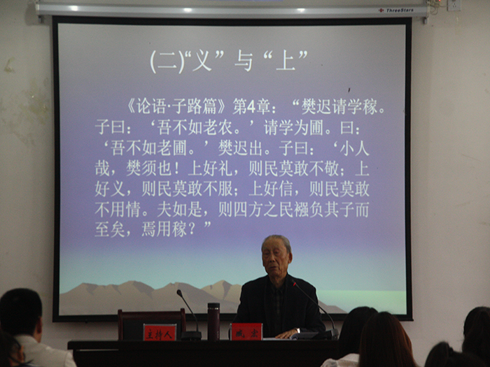 开讲之初,臧宏教授强调本场讲座虽讲文化精粹《论语》,但与现实联系密切,且与当代提倡的核心价值观十分契合。臧宏教授从“义”与“君子”、“义”与“上”、“义”与“知”、“义”与“德”“学”“不善”、“义”与“达”和“义”与“成人”六个方面讲述。