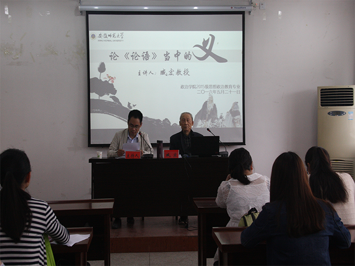 本网讯(文/刘淇梦 摄/杨雪茹)为了引导政教学子深入阅读《论语》,体味经典之中的大“义”,学习君子之道,2016年5月21日下午,公司关工委臧宏教授在公司五楼报告厅为2015级政教学子讲述《论语》中的“义”专题讲座。本次讲座由2015级辅导员周楠主持。
