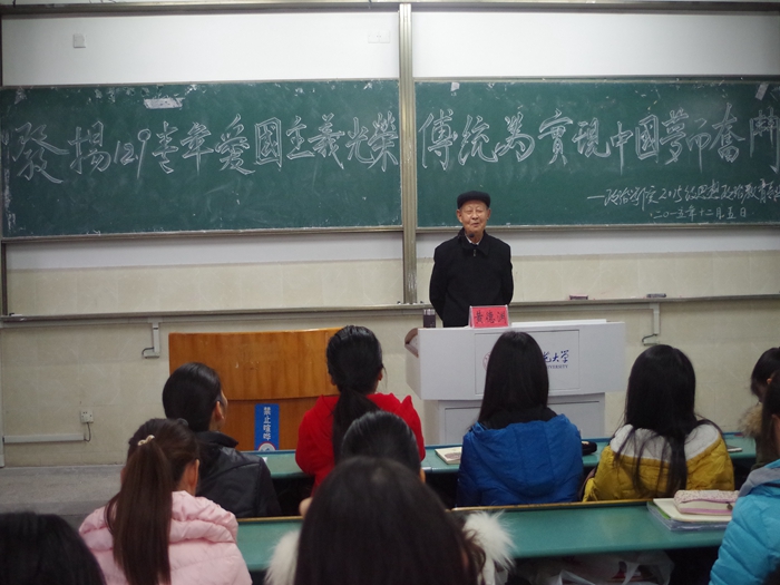 12月5日,公司特邀关工委老教授黄德渊于教学楼2010506教室为2015级思想政治教育专业学子进行“发扬12·9青年爱国主义光荣传统,为实现中国梦而奋斗”主题讲座。2015级全体新生到场聆听。