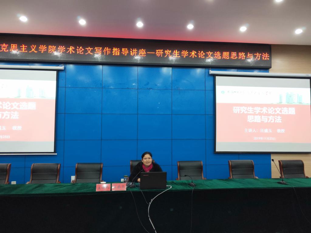 汪教授从“何为研究生论文选题、研究生学术论文选题思路和研究生学术论文选题的方法”三个层面向同学们讲授。首先,她从学术性论题的内涵和外延两个关键方面系统地阐述了何为研究生论文选题;其次,汪教授结合自身多年的科研实践和教学经验,讲授了研究生论文选题思路。她表示在学术论文的选题思路上要以积极的态度为动力、以熟悉的素材为前提、以自身的功底为保障;最后,汪教授结合实例向大家详细讲解了研究生学术论文选题的原则、要求和方法,即:必须坚持优先考虑主流,注重学术性,要具有前瞻性和预见性;要灵活运用创新选题法、延伸选题法、热点选题法等方法。汪教授强调在从事学术研究的过程中要把学术论文选题当作人生的境界加以修炼,始于执着,敬于规范,合于兴趣,久于练就,终于学术。