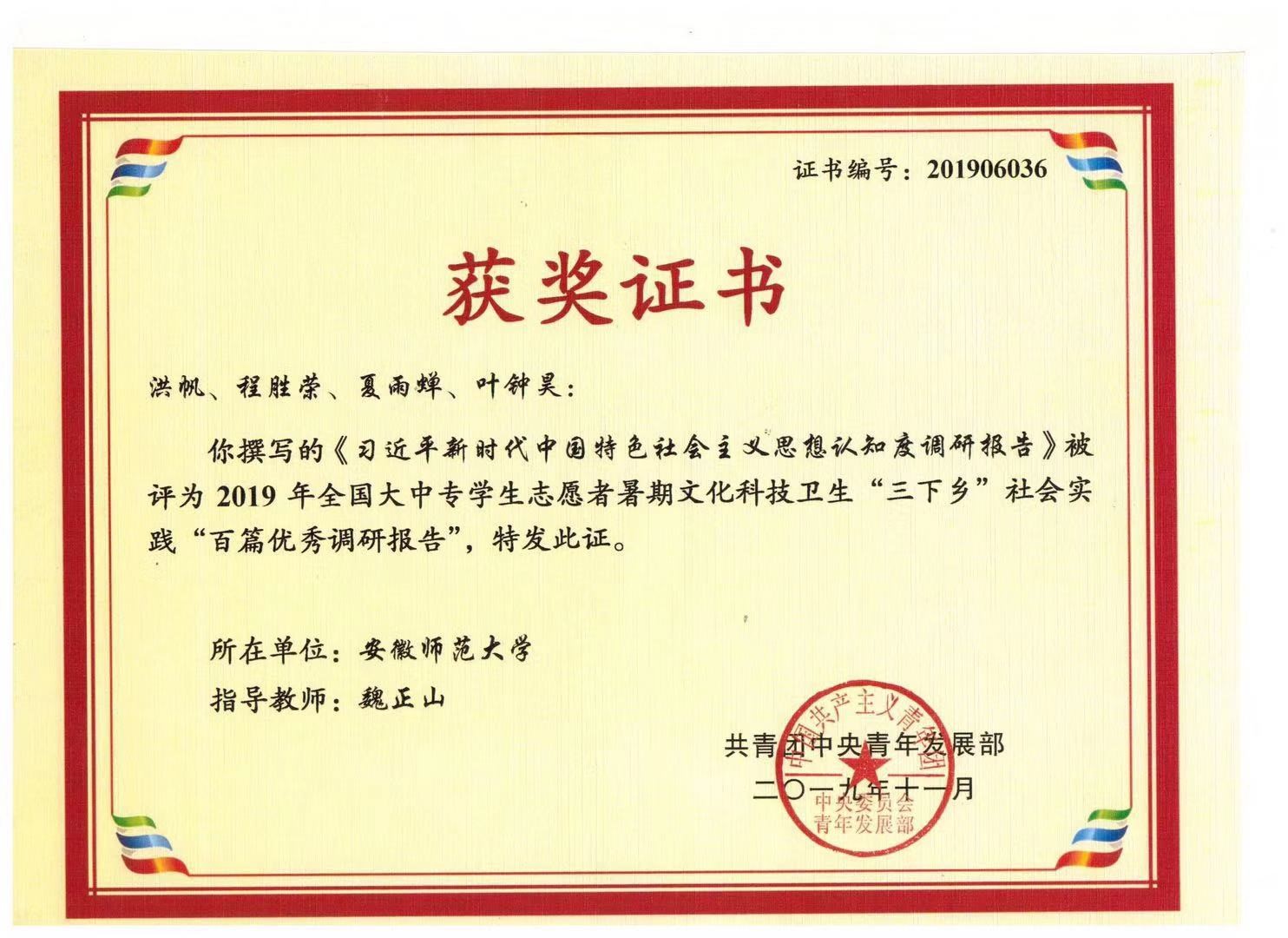 本网讯(文/洪帆)近日,共青团中央公布了2019年全国大中专员工志愿者暑期文化科技卫生“三下乡”社会实践成果遴选结果。公司2017级本科生洪帆、程胜荣、夏雨蝉、叶钟昊同学撰写的社会实践调研报告《习近平新时代中国特色社会主义思想认知度调研报告》(指导教师:魏正山)入选全国“百篇优秀调研报告”。
