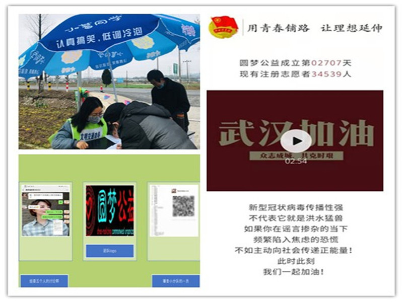 聚是一团火,散是满天星。疫情当前,beet365学子通过线上线下各种方式在全国各地发光发热,勇当排头兵。来自安徽省天长市的18级本科生董礼佳在家乡为市民们登记居民出入信息、检查出入证。18政教的江艳表示:“我愿意为疫情防控工作贡献自己微薄的力量,响应村委会的号召与征集,积极参与疫情防控志愿工作。”19级本科生宋欣悦在街道劝导市民尽量减少外出,帮助社区开展疫情防控宣传布置工作。19级本科生韦杨叶在征得家人同意和做好自身防护的基础上,结合实际情况,安全有序地参与开展便民服务,用实际行动助力当地疫情阻击工作。尽管疫情来势汹汹,beet365学子都坚定地践行着隔离病毒,但不能隔离爱的宗旨,除了积极参与线下志愿工作之外,还有部分同学成为了线上宣传者,为疫情的宣传防控贡献自己的力量。18级本科生梁秋菊志愿加入南京圆梦公益团队,利用个人媒体平台进行线上疫情宣传,协助制作宣传材料。19级本科生雷霁雯心系武汉,她通过加入圆梦公益团队成为一名线上宣传工作者,为湖北地区尤其是武汉的筹款、筹物做出贡献,并通过线上作品为武汉群众加油鼓劲。