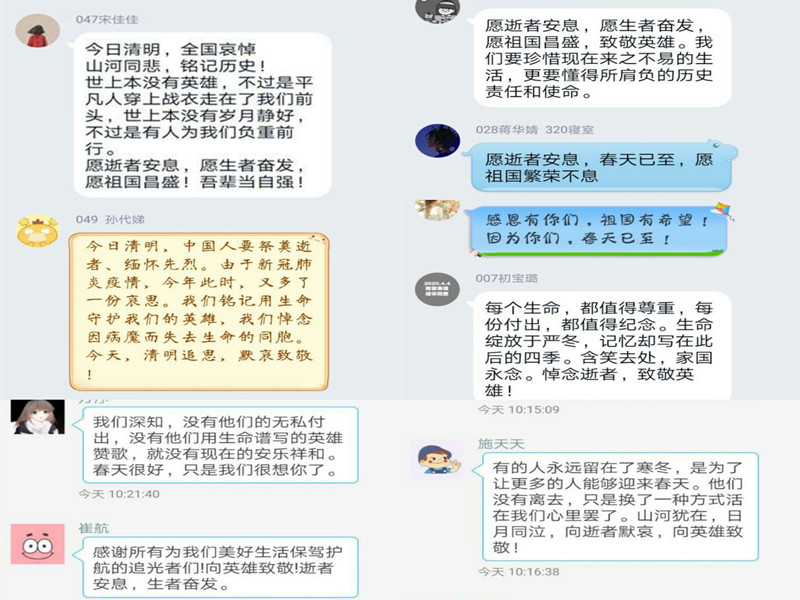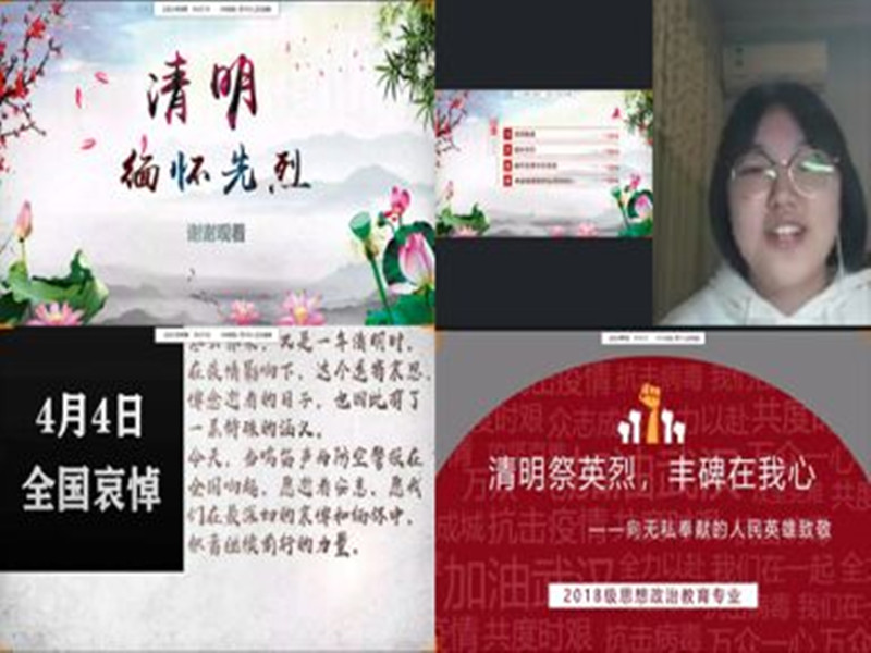 晚上7点开始,19、18政教相继开展了“清明祭英烈,丰碑在我心”主题团日活动。19政教班活动由团支书丁小羽主持召开,分四部分展开。首先,丁小羽简单概述了清明节的相关知识,向同学们介绍了清明节名称的来源和节日起源。接着她讲述了革命烈士董存瑞、邱少云和杨根思的英雄事迹,缅怀先烈,弘扬了爱国主义精神。随后丁小羽介绍了在抗疫过程中涌现的因公殉职的抗疫医护人员的事迹,如被誉为“吹哨人”的李文亮医生、义无反顾冲锋“疫”线的宋英杰医生等,告诉同学们没有人生而英勇,只是选择白衣执甲、逆风而行,让同学们认识到医护人员的艰辛和伟大,提醒同学们珍惜现在的美好生活,学会感恩,学会珍惜,学会奉献。最后,丁小羽介绍了新中国的辉煌成就,呼吁同学们厚植爱国主义精神,承担起时代赋予的使命和任务。晚上8点,18政教团支书李欣潞主持召开“清明祭英烈,丰碑在我心”主题团日活动。首先,李欣潞带领大家共同学习习近平总书记《在湖北省考察新冠肺炎疫情防控工作时的讲话》,着重强调了湖北和武汉是这次疫情防控斗争的重中之重和决胜之地、把医疗救治工作摆在第一位、打好群防群控的人民战争等伟大思想。接着,她向同学们介绍了疫情防控牺牲烈士的简要情况。他们是人民警察、是白衣天使、是抗疫一线逆行的战士,他们用生命保护了我们,他们拥有最勇敢的心与最广博的爱。随后,班级里两位同学向大家分享了动人的抗疫烈士故事。那些无私奉献、无畏牺牲的烈士,是人民的铠甲,是共和国的骄傲,在这个通往春天的故事里,他们永远活在我们心中。最后,全班同学交流讨论,表达了对战疫一线的英雄人民的崇高敬意、对牺牲先烈的哀悼缅怀和对未来安康生活的憧憬向往。愿山河无恙,国泰民安!