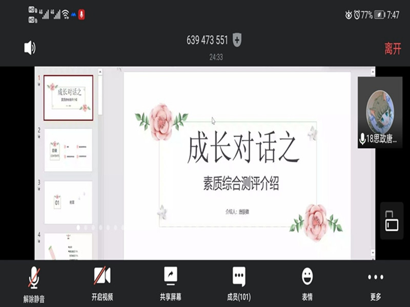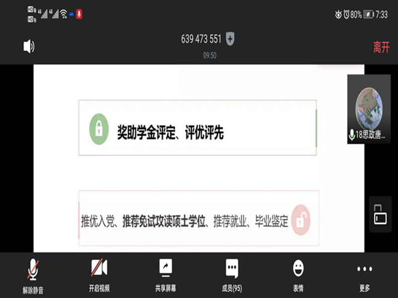 本网讯(文/摄 唐婉玉)为了帮助新生同学更好的理解综合测评成绩的构成与重要性,5月20日,2019级思想政治教育专业在线上开展“成长对话之素质综合测评介绍”主题讲座,本次讲座邀请了2018级思想政治教育专业的唐银徽担任主讲人,19政教专业全体本科生参加。