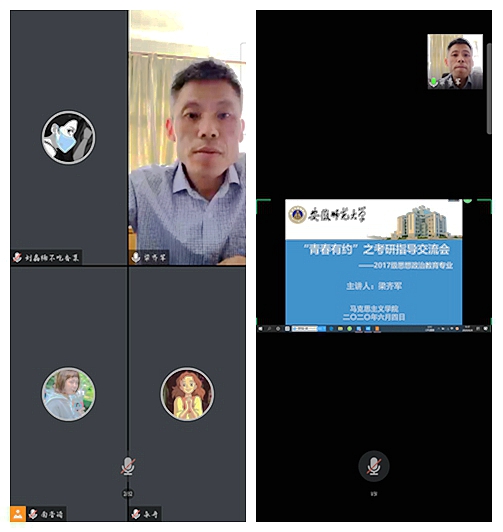 本网讯(文/陈依婷 摄/刘鑫楠 )为帮助2017级本科员工尽快地在考研准备中找到方向、明确目标、凝聚力量和调整心态,同时也为同学们报考公司提供参考,6月4日上午线上开展了“青春有约”之考研指导交流会。本次活动邀请了公司党委副书记梁齐军担任主讲人,2017级本科生辅导员夏盼盼主持,2017级思想政治教育专业全体同学参加会议。