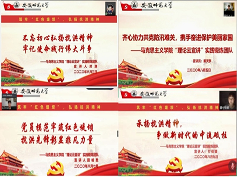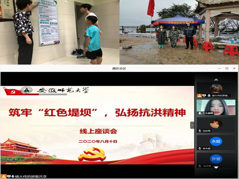 纸上得来终觉浅,绝知此事要躬行。团队走访部分受灾地区群众,询问了解当地群众的困难和需求,协助社区工作人员做好后勤保障工作并向受灾群众宣讲防洪知识。团队宣传员郑雨嫣更是主动前往受灾社区,成为一名防汛救灾志愿者。队员们守着初心、带着爱心、坚定决心、齐心协力为打赢这场抗洪阻击战汇聚力量。为加深对抗洪抢险工作的认识,深入学习习近平总书记关于做好当前防汛救灾工作的重要讲话精神,总结交流本次暑期社会实践活动,实践团队全体队员聆听了由安徽省合肥市肥西县三河镇二龙街社区抗洪志愿者施翊主讲的线上座谈会。在深入了解了目前抗洪的具体举措和社区规划的同时,施翊和同事们的亲身经历更是让每一个队员都深切感受到抗洪英雄们舍小家顾大家,义无反顾冲一线的决心和勇气。志愿公益、处处可为,队员们在一次次抗洪实践中,在志愿服务中凝聚青春力量、发挥青春作用,展现青春风采。