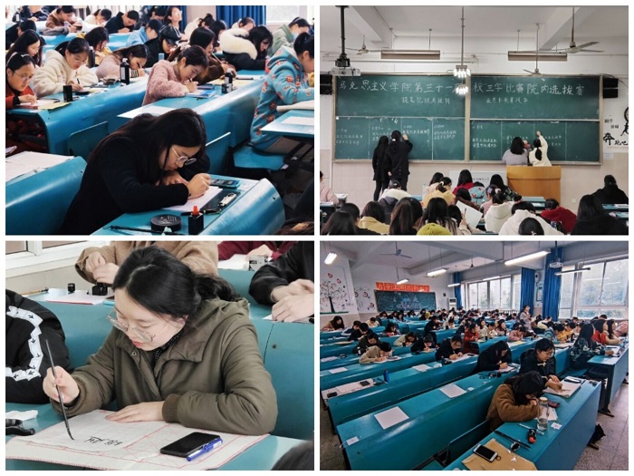 本次比赛分为三项:粉笔字、钢笔字和毛笔字书写。粉笔字书写内容为“提笔忆抗美援朝,染墨书先辈风华”。寓意不忘历史,尊重历史,铭记人民英雄,弘扬伟大的抗美援朝精神。钢笔字书写内容是毛泽东的《七律·答友人》,旨在培养爱国主义情怀,不忘初心,牢记使命。毛笔字书写内容根据主题自拟,为选手提供自由发挥,展示自我的空间。参赛选手都认真准备,按时道场签到。比赛正式开始后,选手们凝神聚气,笔走龙蛇,将所有的注意力都汇集在笔尖,行云流水,挥毫落纸如云烟。